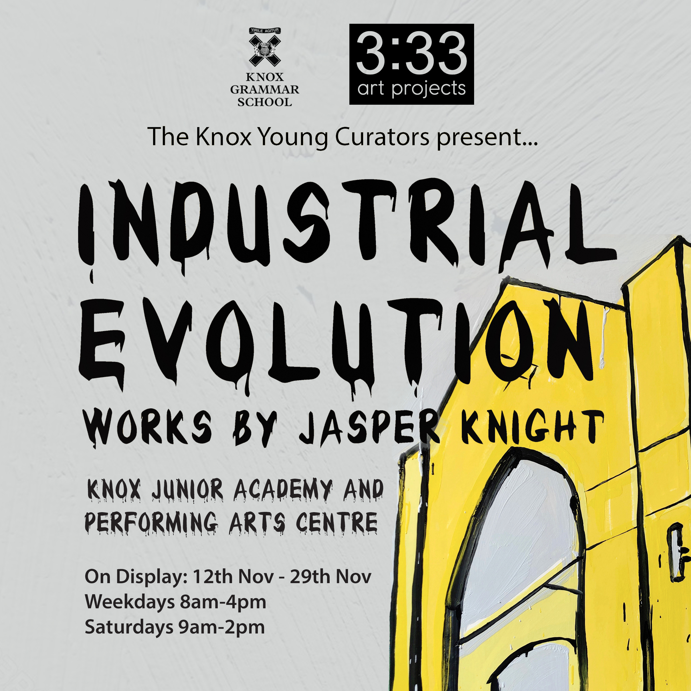 Industrial Evolution is open Saturday 9am-2pm. This will be the last weekend that you can catch the incredible works of Jasper Knight curated by the Knox Young Curators. The show will remain open Mon-Fri, 8am-4pm until Friday the 29 November.