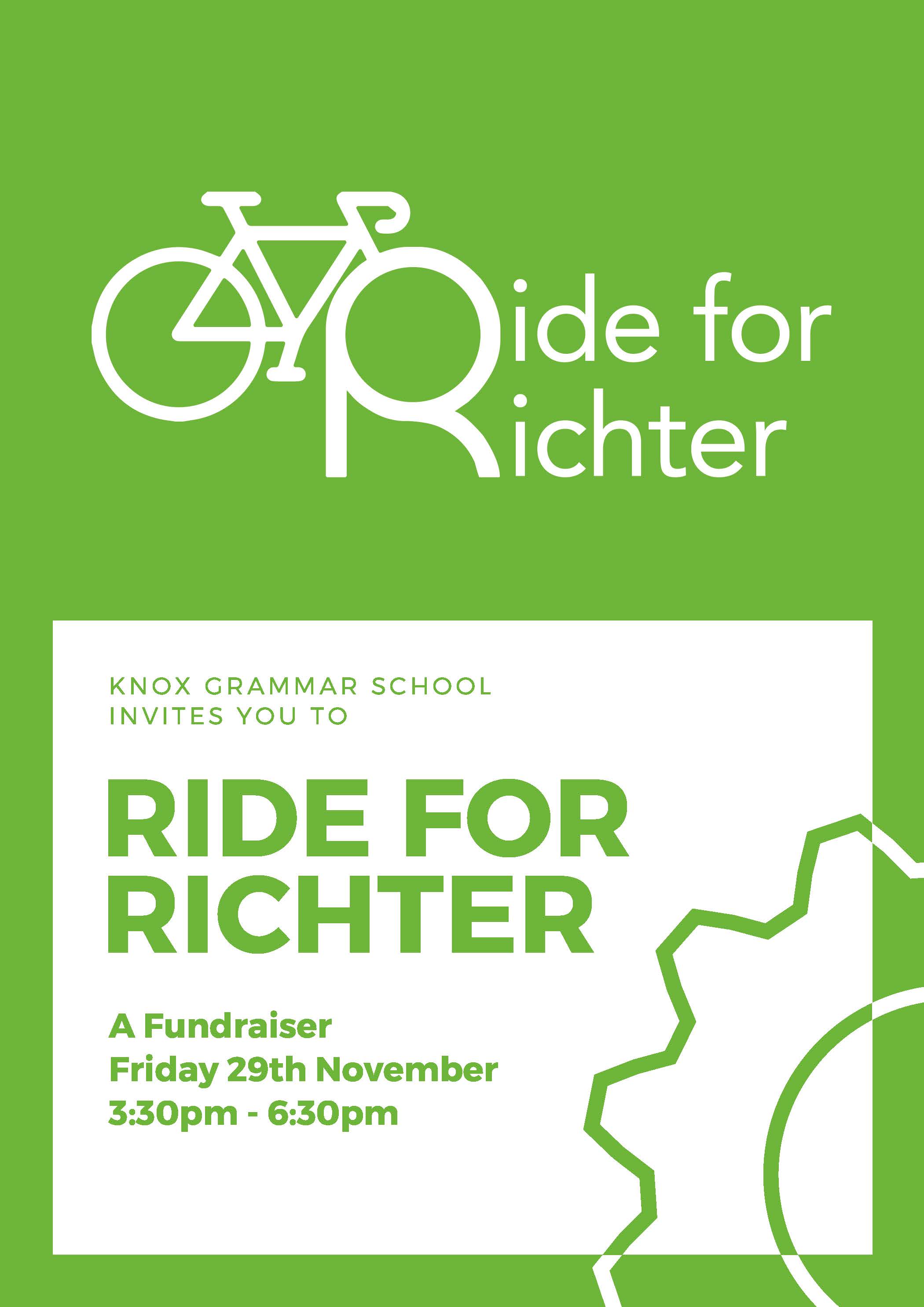 On Friday, 29 November Year 12 have organised a fundraiser to support one of their peers. The fundraiser is 'Ride for Richter' and this event will run from 3.30pm–6.30pm. Alex Richter (Y12) was injured in a mountain biking accident in the holidays. This fundraiser is to raise money for the Richter family for medical costs and day-to-day requirements.