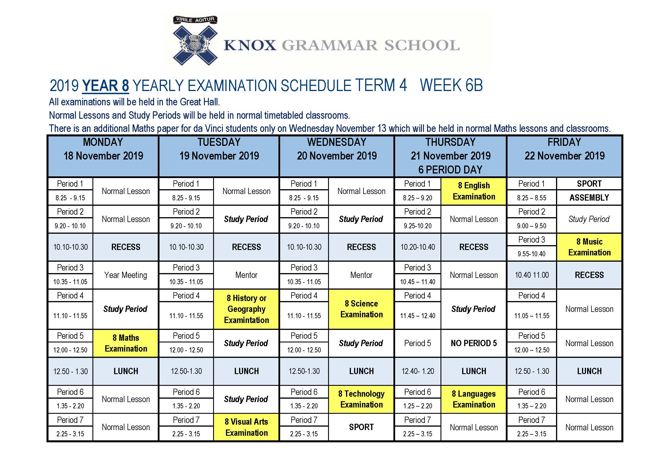 The Year 8 Yearly Examination Timetable has now been published (see below). Examinations for Year 8 will take place in Week 6 Monday 18 - Friday 22 November. (Note that there is an additional Maths paper for da Vinci students only on Wednesday 13 November). During the examination week, the boys will have normal lessons/activities, including sport, PDHPE practicals and cadets for any periods not designated as a study or examination period. All examinations will be held in the Great Hall, except for the additional Maths paper for da Vinci students only which will be held in normal Maths lessons and classrooms.